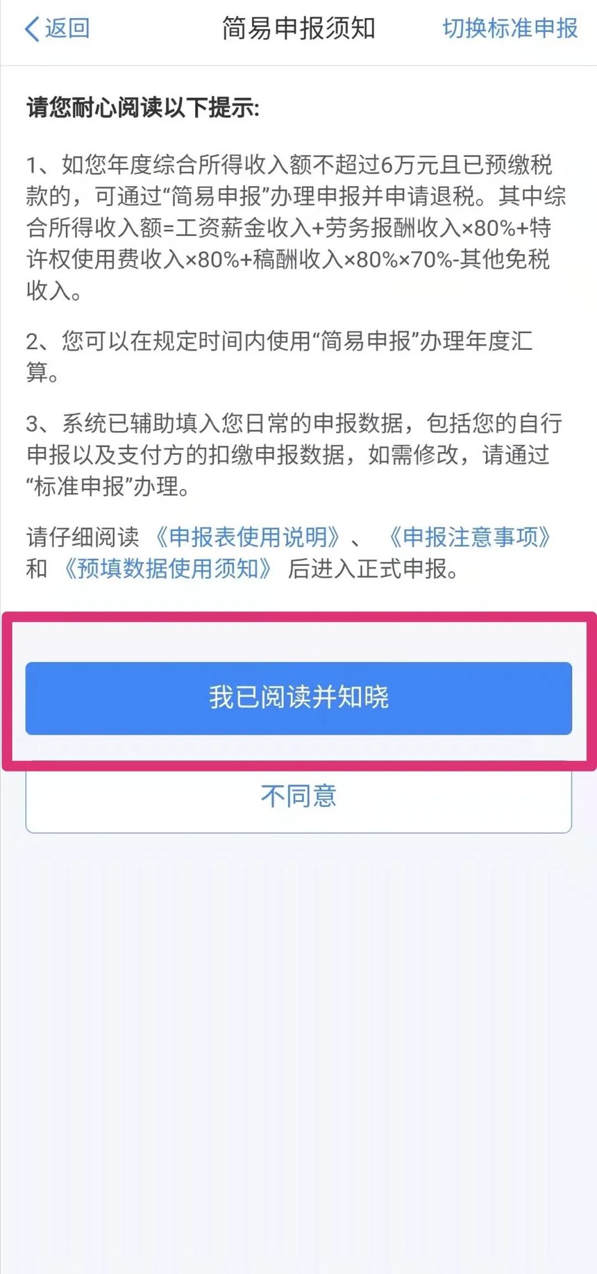 居民个人在纳税年度内取得的综合所得全年收入额不超过6万元且已预缴个人所得税的纳税人,可通过简易申报功能办理年度汇算申报。您只需确认已预缴税额、填写本人银行账户信息,即可通过网络实现快捷办理。