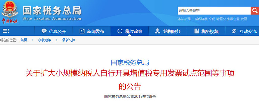 税总发布《关于扩大小规模纳税人自行开具增值税专用发票试点范围等事项的公告》(国家税务总局公告2019年第8号),决定:扩大小规模纳税人自行开具增值税专用发票试点范围、扩大取消增值税发票认证的纳税人范围。